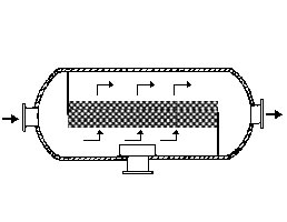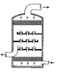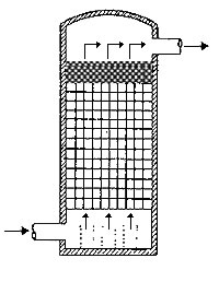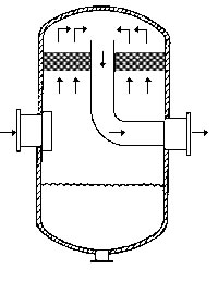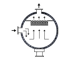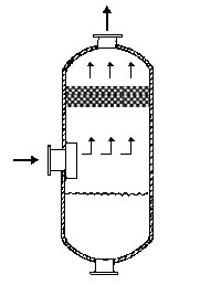 在通常的化工操作中所碰到的氣體中分散液滴的直徑約在0.1~5000μm。一般粒徑在100μm以上的顆粒因沉降速度較快,其分離問題很容易解決。通常直徑大于50μm的液滴,可用重力沉降法分離;5μm以上的液滴可用慣性碰撞及離心分離法;對于更小的細霧則要設法使其聚集形成較大顆粒,或用纖維過濾器及靜電除霧器。絲網除沫器,其主要用于分離直徑大于3μm~5μm的液滴,工作原理如右圖所示。當帶有霧沫的氣體以一定的速度上升,通過架在格柵上的金屬絲網時,由于霧沫上升的慣性作用,使得霧沫與細絲碰撞而粘附在細絲的表面上。細絲表面上的霧沫進一步擴散及霧沫本身的重力沉降,使霧沫形成較大的液滴沿著細絲流至它的交織處。由于細絲的可濕性、液體的表面張力及細絲的毛細管作用,使得液滴越來越大,直至其自身的重力超過氣體上升的浮力和液體表面張力的合力時,就被分離而下落,流至容器的下游設備中。只要操作氣速等條件選擇得當,氣體通過絲網除沫器后,其除沫效率可達到97%以上,可以達到完全去除霧沫的目的。絲網除沫器(除霧器)用于分離塔中氣體夾帶的液滴,以保證有傳質效率,降低有價值的物料損失和改善塔后壓縮機的操作,一般多在塔頂設置絲網除沫器。可有效去除3--5um的霧滴,塔盤間若設置除沫器,不僅可保證塔盤的傳質效率,還可以減小板間距。所以絲網除沫器主要用于氣液分離。亦可為空氣過濾器用于氣體分離。此外,除沫器絲網還可作為儀表工業中各類儀表的緩沖器,以防止電波干擾的電子屏蔽器等。在化工工藝過程中,各種氣液相接觸設備的氣體離開設備時往往夾帶著不少液滴,如塔類設備、蒸發器等。一般要求把氣體中夾帶的液滴分離出來,以免影響氣體的品質或下道工序的操作。從氣體分離液滴或霧沫的機理有重力下降、慣性碰撞、離心分離、布朗運動的擴散沉積和靜電吸引。絲網除沫器是屬于慣性碰撞除沫中的典型產品,是一種高效的氣液分離設備。它具有除沫效率高、結構簡單、空隙率大、壓力降小、重量輕,安裝、操作、維修方便等特點。當氣體自下而上通過絲網除沫器時,由于慣性作用與絲網表面碰撞,霧沫隨即在細絲表面聚集而擴張,不斷變大的液滴由于重量產生的重力超過氣速和液體表面的張力的合力時,液滴就下落。工業上常用于塔器、蒸發器和分離器等。